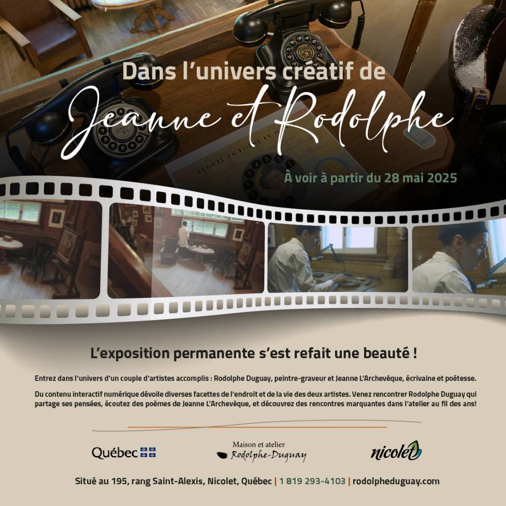 - À partir du 4 mai 2025, la Maison et atelier Rodolphe-Duguay est ouverte du mardi au dimanche de 10 h à 16 h.